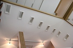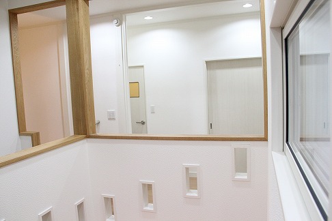 既存の和壁から、光感じる明るいセンターホールスペースへ変える為、アイボリー又はホワイトカラーのクロスで仕上げました。 床は特殊建材の超薄型ウッディ材フローリングで仕上げ、この家の大事なこの場所である気持ち良いセンターホールを仕上げました。 上部天井も解体し、既存天井より高さを出した吹抜けを実現し、 ローコストによるデザイン照明工事と家全体の風流動を考え吹抜け上部にシーリングファンと空気開口を取り付けました。